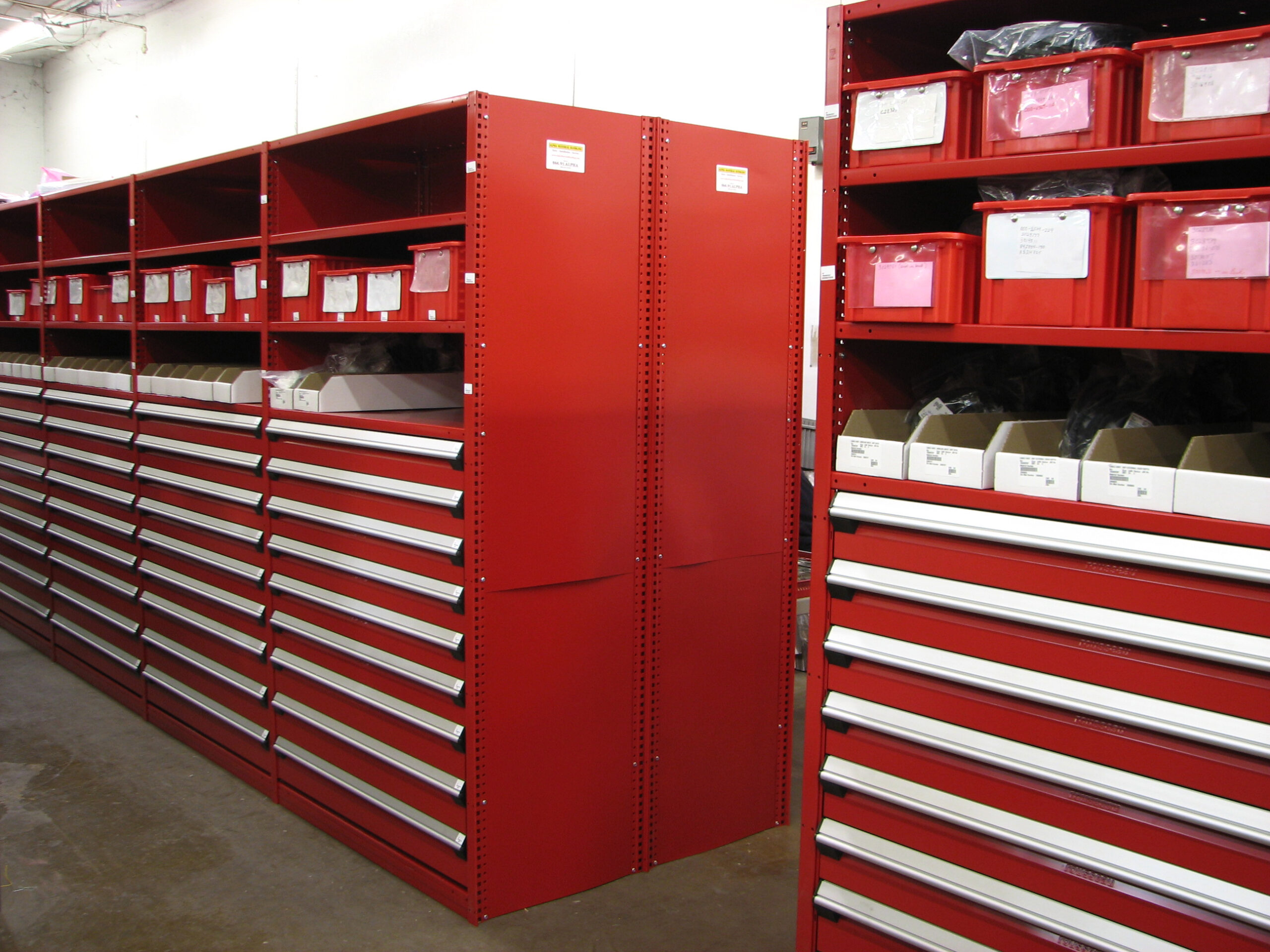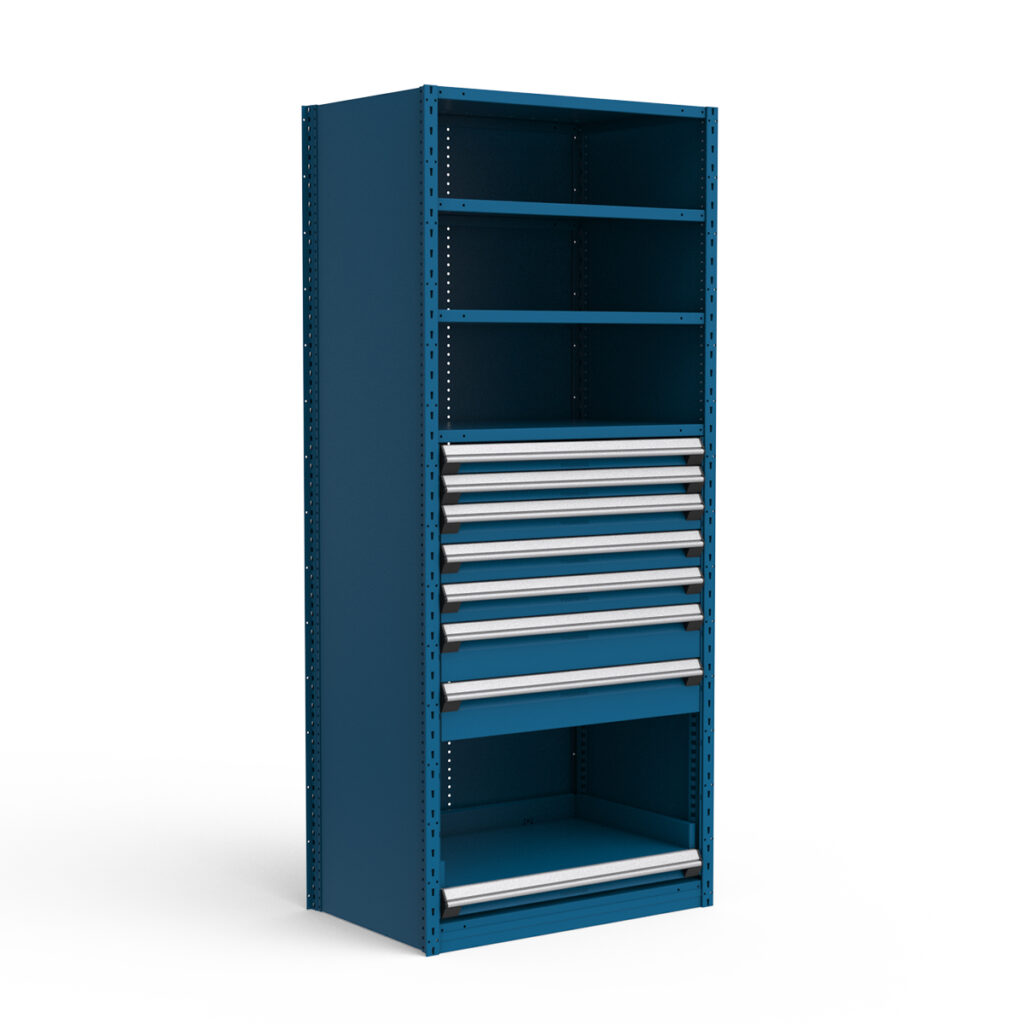 Our industrial storage cabinets recover up to 70% floor space by utilizing high-density vertical drawer systems.